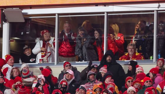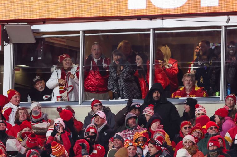 KANSAS CITY, MISSOURI – JANUARY 18: Taylor Swift and Caitlin Clark look on from a box during an NFL football AFC divisional playoff game between the Houston Texans and the Kansas City Chiefs at GEHA Field at Arrowhead Stadium on January 18, 2025 in Kansas City, Missouri. (Photo by Perry Knotts/Getty Images) c