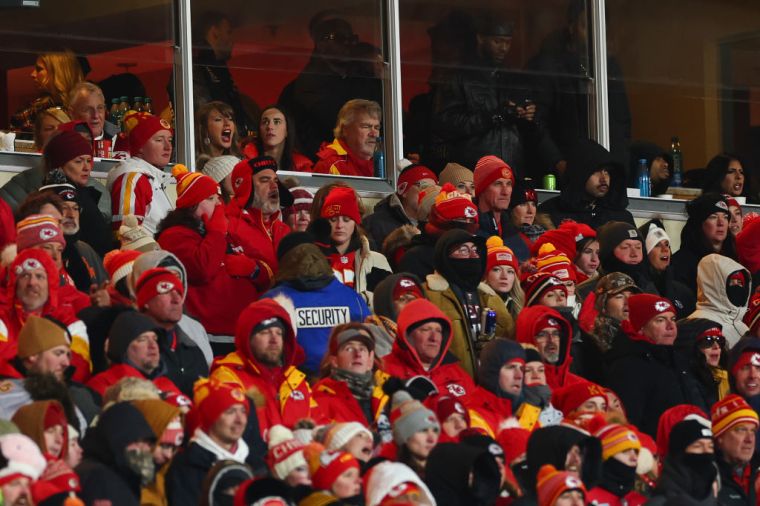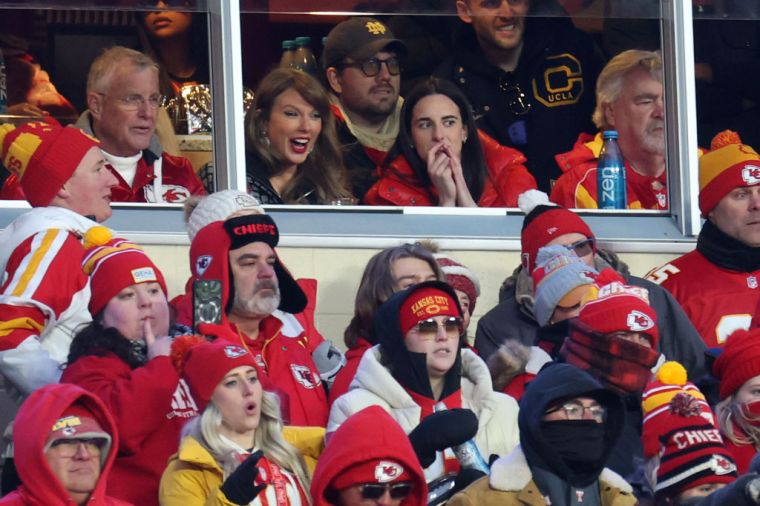 KANSAS CITY, MISSOURI – JANUARY 18: Taylor Swift and Caitlin Clark look on from a box during an NFL football AFC divisional playoff game between the Houston Texans and the Kansas City Chiefs at GEHA Field at Arrowhead Stadium on January 18, 2025 in Kansas City, Missouri. (Photo by Perry Knotts/Getty Images)